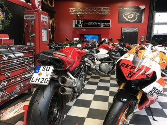 Hennes Löhr: Am Anfang steht immer ein neues Motorradmodell. Wir müssen das Modell am Prüfstand und auch hier in der Werkstatt komplett komplett durch und testen. Bis wir den Serienmotor verstehen, haben wir gut und gerne 40 Prüfstandsläufe durchgemacht. Danach beginnen wir mit unserem Standardprogramm und testen immer wieder wie der Motor auf die einzelnen Schritte reagiert. Quetschkante ändern, Ansaugkanäle polieren und mit einer definierten Rauigkeit versehen, Zylinderkopf planen usw. Am Ende haben wir in dieses eine Projekt richtig viel Zeit investiert und haben aber auch ein richtig gutes Ergebnis. Dieser eine Motor wäre dann natürlich so nicht zu verkaufen – viel zu teuer. Aber wir haben uns spezialisiert und bieten eben nur Motorentuning an und auch hier eben wieder nur für die japanischen Vierzylinder, MV Agusta und die neue V4 von Aprilia. So können wir dann dieses ermittelte und fein ausgearbeitete Standardpaket unter Berücksichtigung der Serienstreuung immer und immer wieder anbieten und leistbar verkaufen.